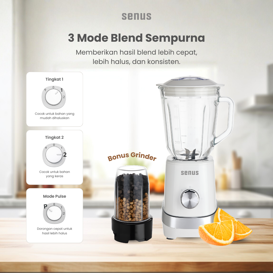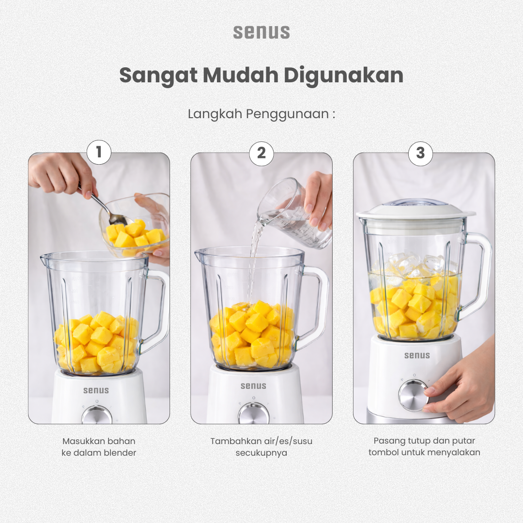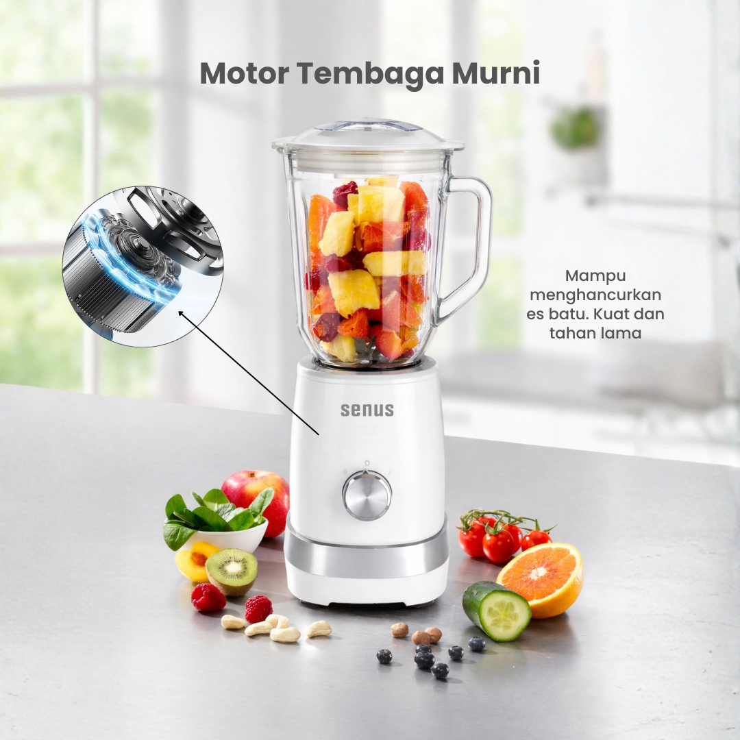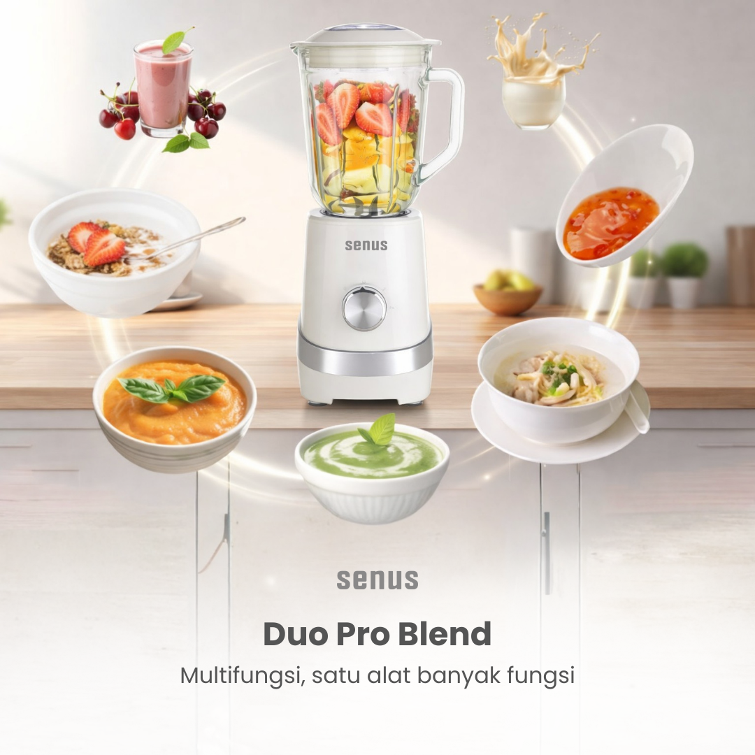 Desc: Blender serbaguna untuk kebutuhan dapur harian keluarga, praktis, kuat, dan hemat listrik. Senus Duo Pro Blend membantu menghaluskan buah, sayur, hingga es batu dengan hasil lebih halus dan konsisten.