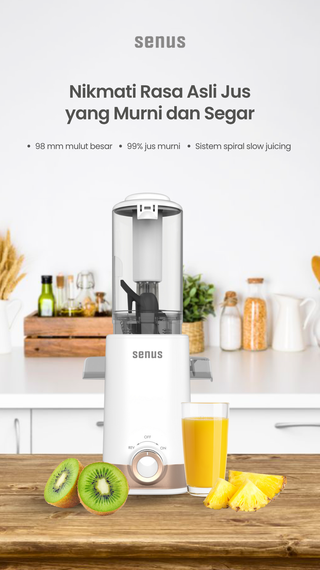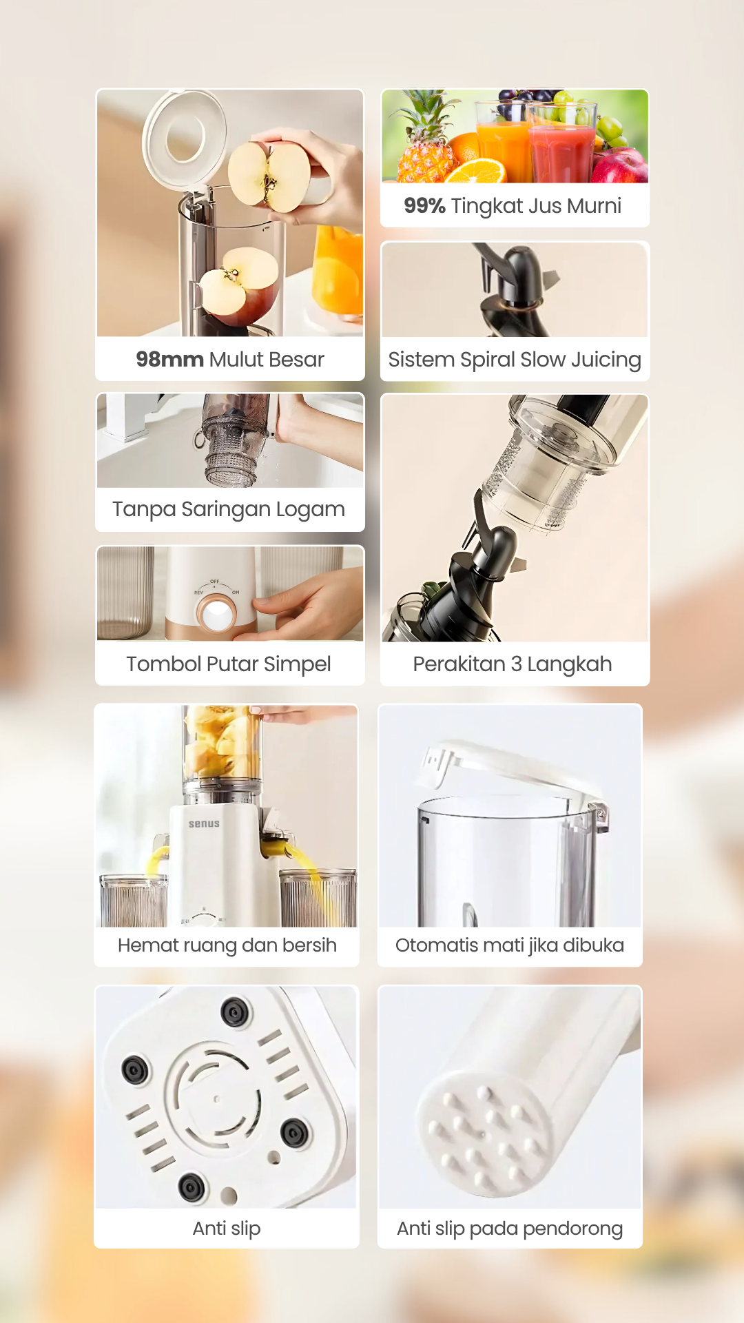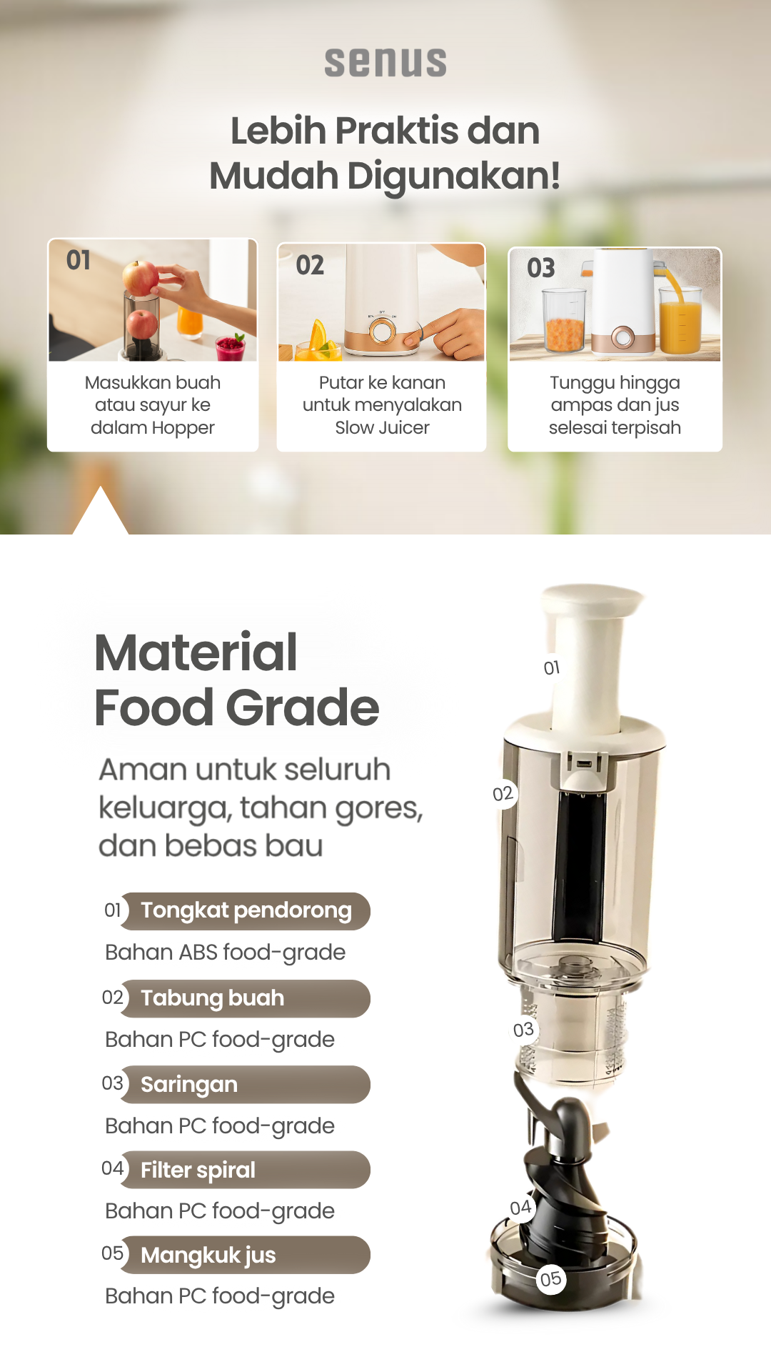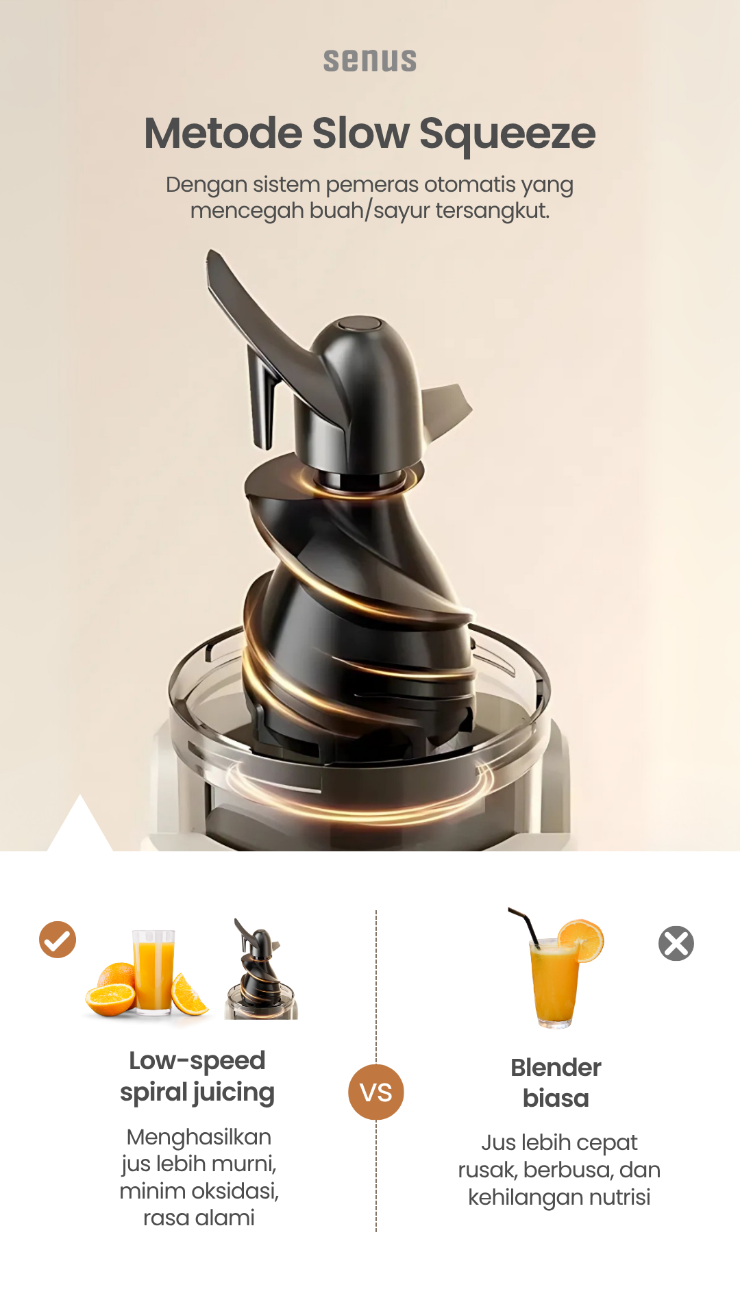 – Senus Slow Juicer dapat menjaga kandungan asli nutrisi dari buah dan sayur dengan slow speed