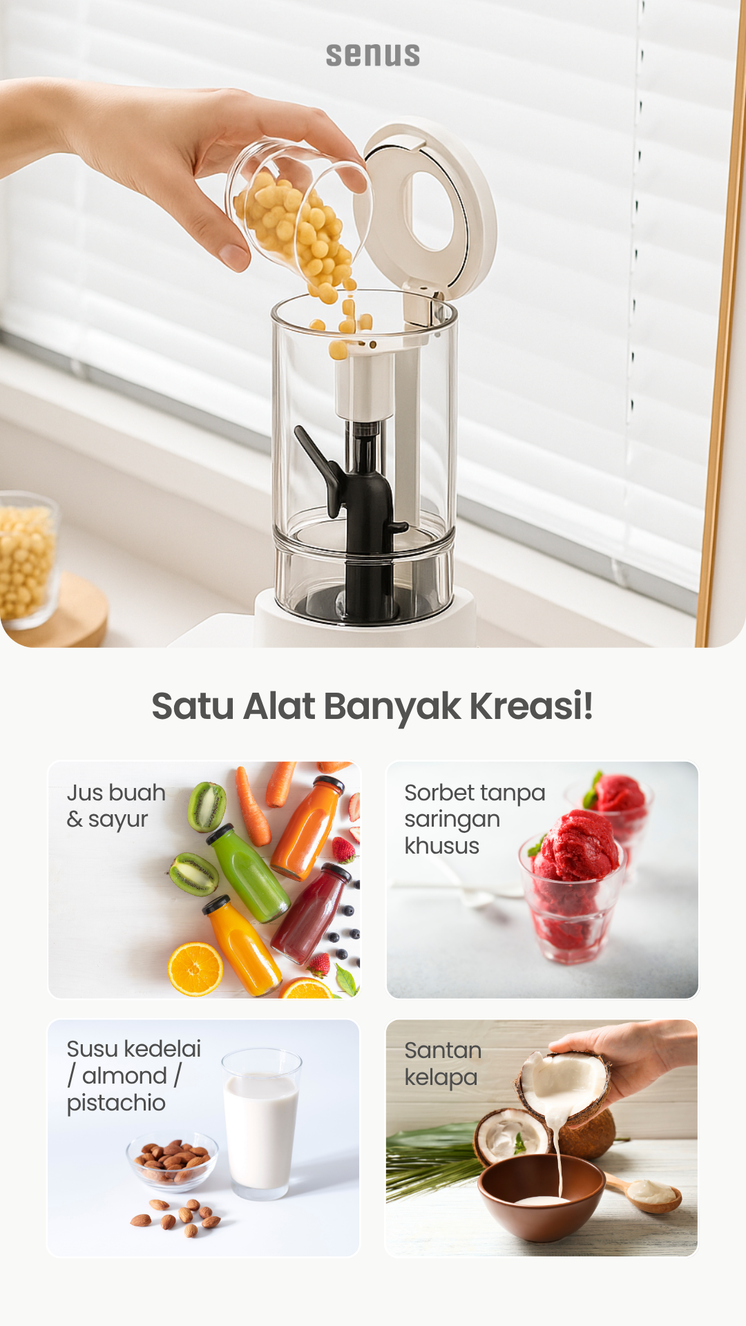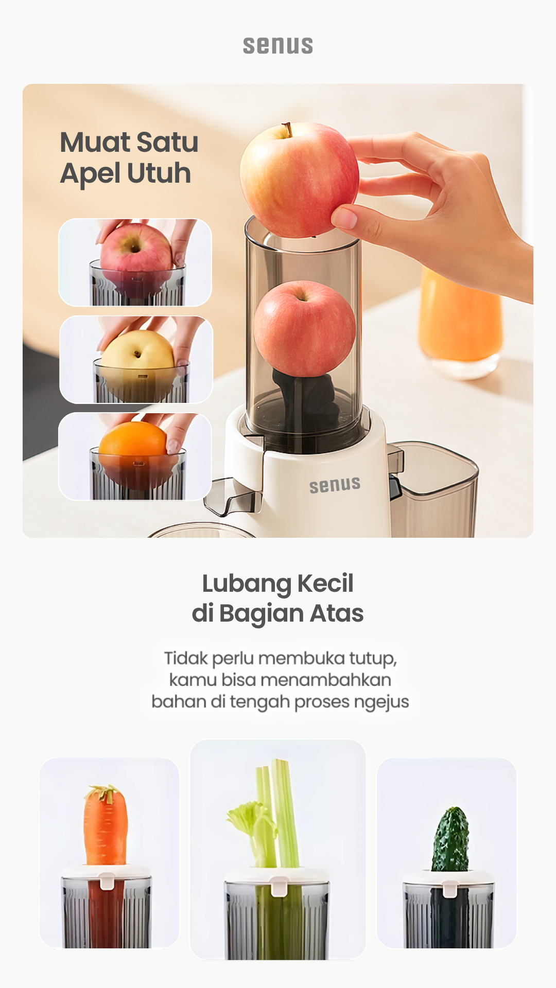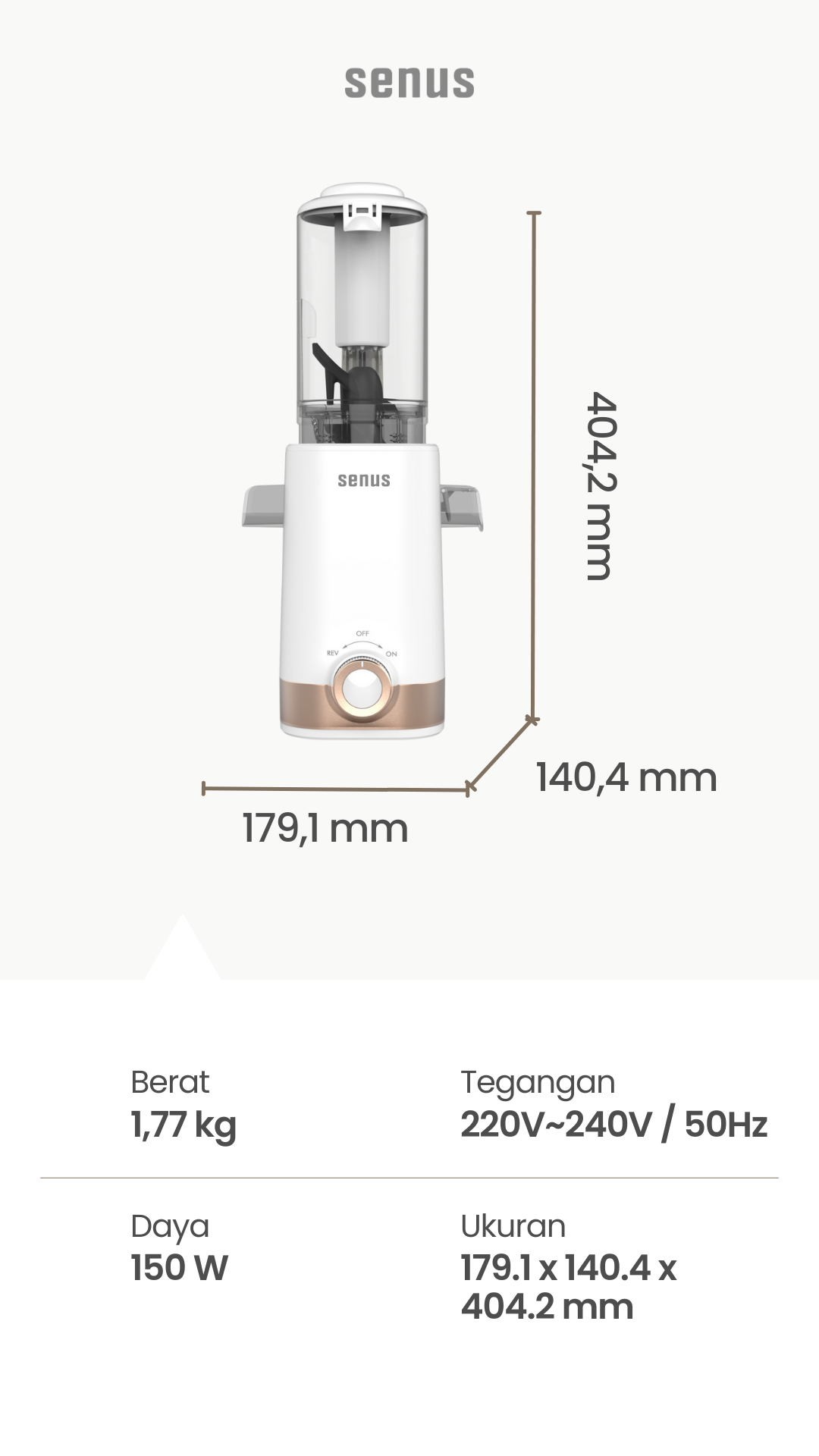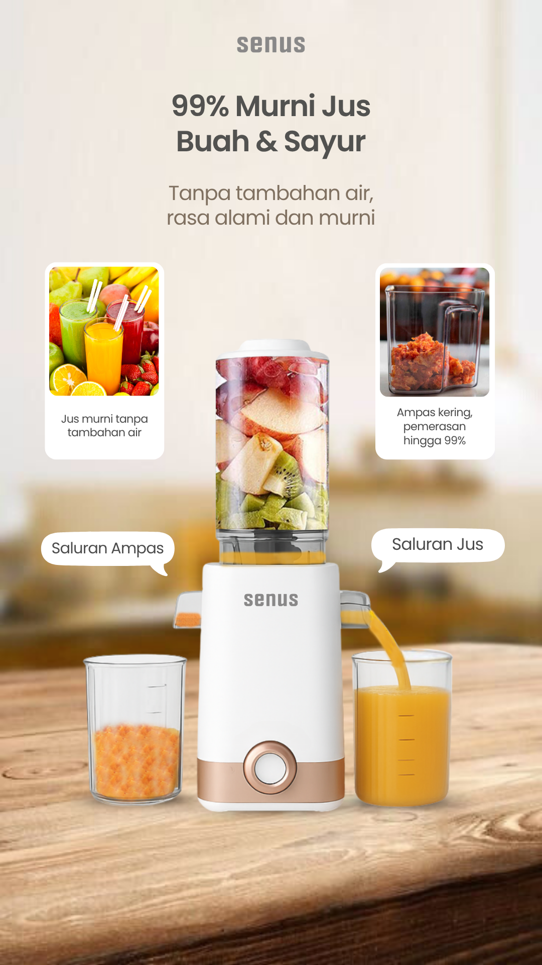 – Senus Slow Juicer dapat menjaga kandungan asli nutrisi dari buah dan sayur dengan slow speed